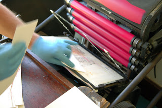 Beautiful Italian ‘Fabriano’ stock made from 100 percent cotton is loaded and pressed against the inked ‘platen’. After only a moment Bill retrieves our first print, saying, “Gutenberg would have known how to use this,” of the man who invented the printing press in the 15th Century.