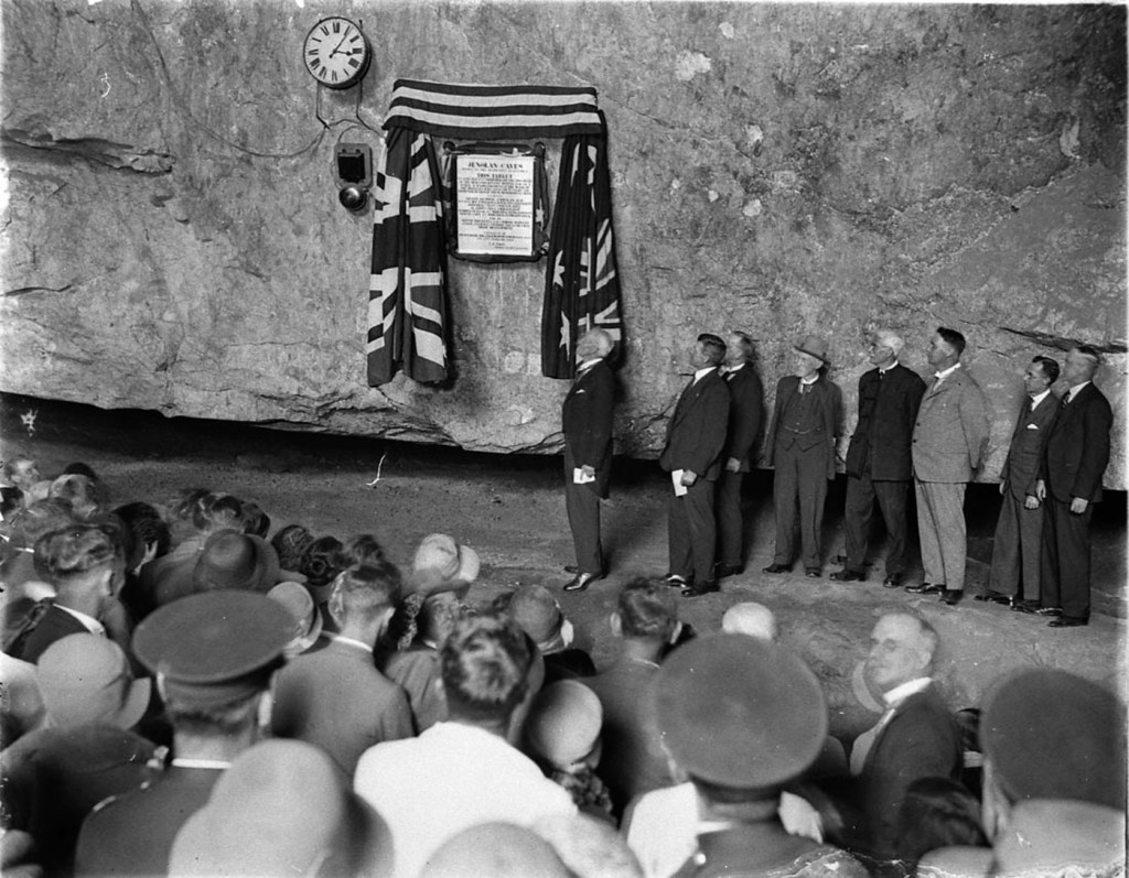 TROUBLING MEMORIAL Unveiling of a plaque by Sir Edgeworth David, to commemorate the discoveries of various caves, February 23, 1929 (Photographer: Sam Hood)