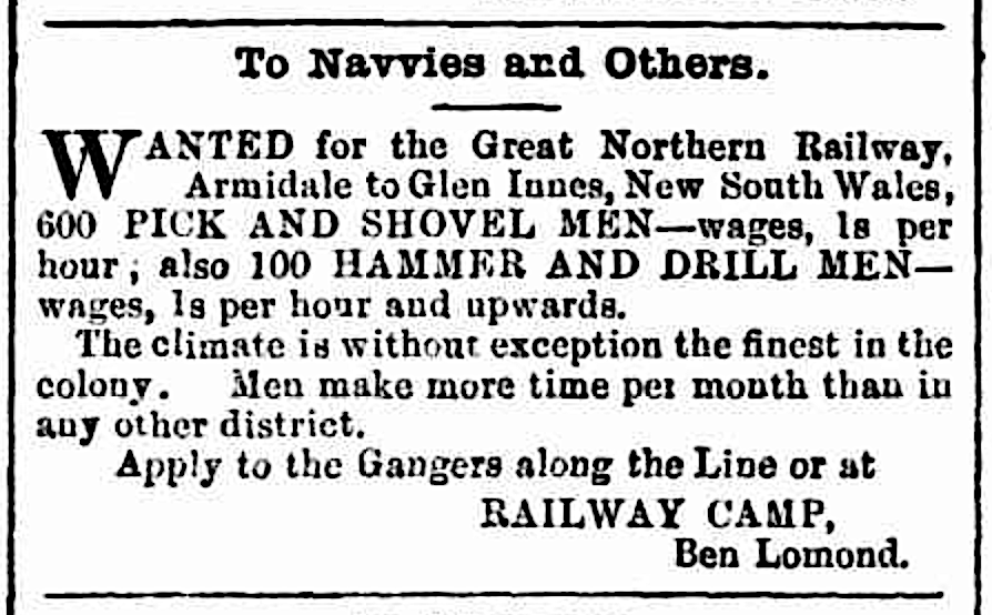 A navvy’s pay on the Great Northern Railway construction from Armidale to Glen Innes was advertised as a shilling an hour for 600 “pick and shovel men”, and 100 “hammer and drill men” earned that as a minimum.