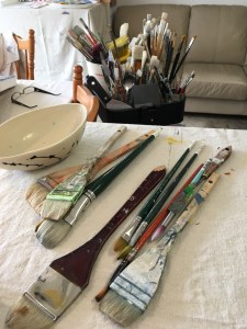 “As a painter, I work by mark making, using movement and form and by layering of colour. I quite often incorporate texture into my paintings, and often paint a canvas over and over again.